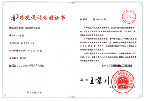 填料專利證書
