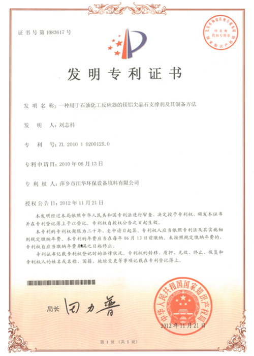 鎂鋁尖晶石支撐劑自主產(chǎn)權(quán)發(fā)明專利證書