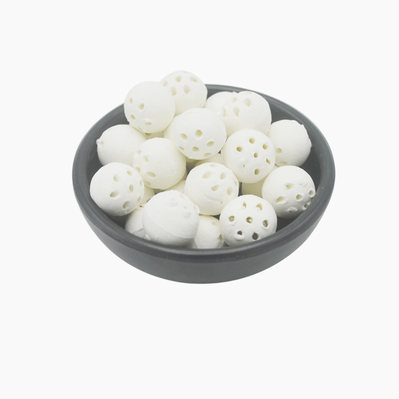 開(kāi)孔瓷球外觀為白色球體,開(kāi)孔互相垂直,開(kāi)孔數(shù)量可以根據(jù)實(shí)際使用需要和瓷球的尺寸大小開(kāi)單孔、三孔、五孔及七孔。