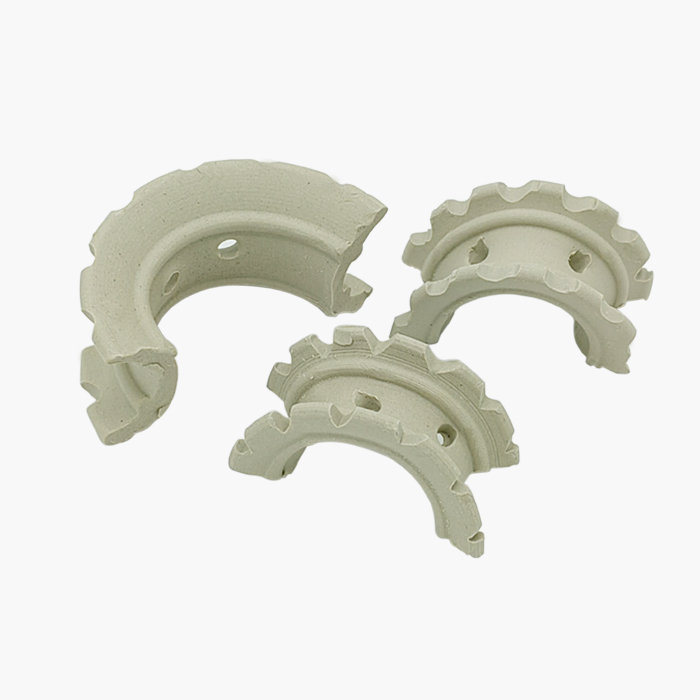 陶瓷異鞍環(huán)填料是在矩鞍環(huán)填料的基礎上加以改進的新型填料,將矩鞍填料的平滑弧形側(cè)面改為鋸齒形或紋紋凸起的側(cè)面。這樣在填料床層內(nèi),增加了填料間接觸的空隙,使之更有利于氣體和液體在填料層中的流動和擴散。