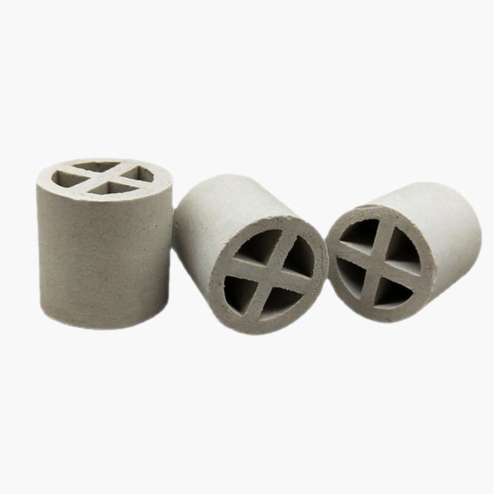 陶瓷十字隔板環(huán)填料是基于增加填料的比表面積,從而強(qiáng)化傳質(zhì)效率而開發(fā)出來的。 其形狀是在拉西環(huán)中間增設(shè)了十字隔板。 一般來講,這種填料由于尺寸較大,僅適用于整體堆徹,目前一般只作為亂堆填料的塔底支撐分布層用。