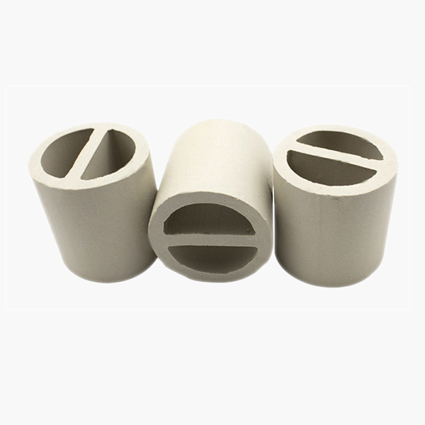 陶瓷一字環(huán)又被稱之為陶瓷勒辛環(huán)。它是在拉西環(huán)原有基礎(chǔ)上基于增加填料的比表 面積和強化傳質(zhì)效率的想法之上在其中間加入像漢字一的一般的隔板而設(shè)計出來的。形象化地稱它為一字環(huán)。陶瓷一字環(huán)是由陶瓷拉西環(huán)改良形成,比陶瓷拉西環(huán)有更大比表面積和更好的抗壓強度,擁有優(yōu)異的耐酸和耐熱性,能夠并且能耐除氫氟酸以外的各種無機酸、有機酸及有機溶劑的腐蝕,并能夠在高溫或者低溫的環(huán)境下使用,因此其使用范圍非常廣泛。